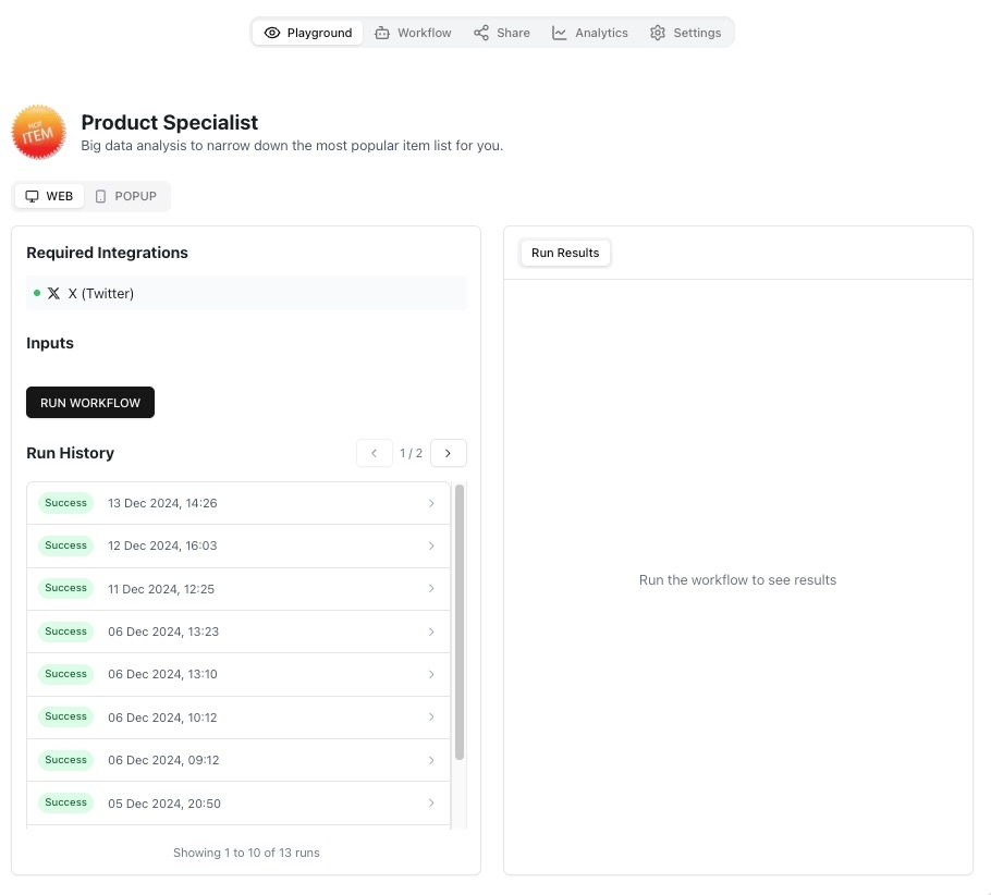 The Run Results panel on the right displays the output of your workflow tests. This allows you to assess the accuracy and effectiveness of your workflow in real-time.